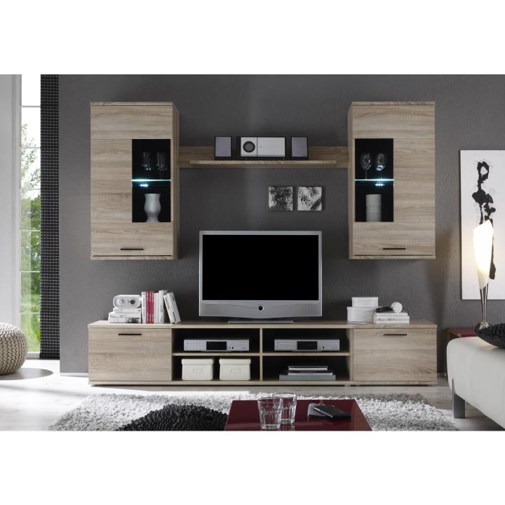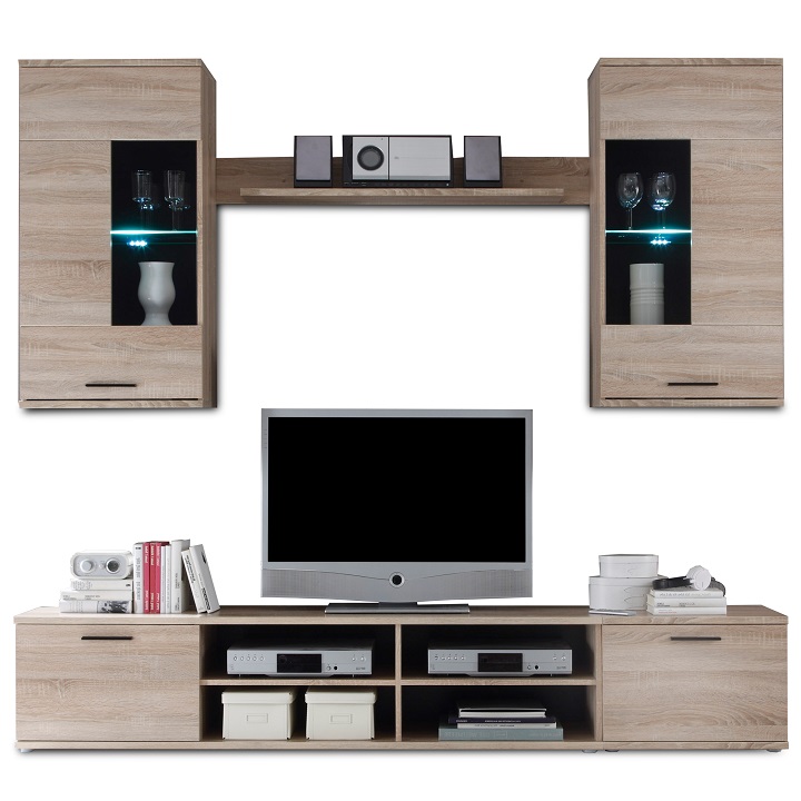 Dizajnová obývacia stena Frontal 2 v odtieni dub sonoma s vitrínami s príťažlivým modrofialovým LED osvetlením.
