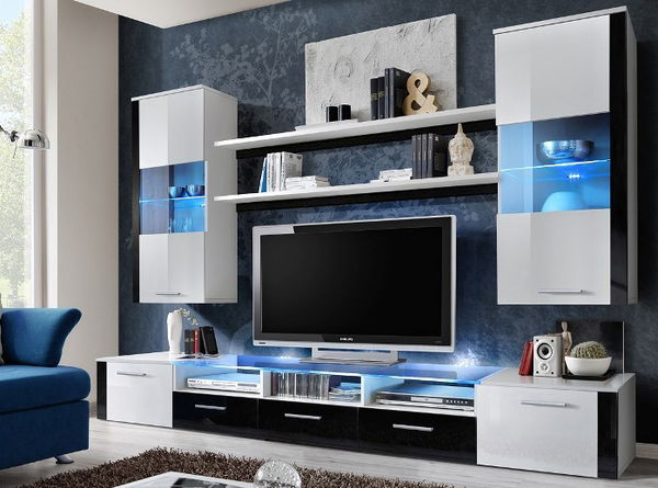Obývacia stena Fresh bude moderným doplnkom vo Vašej obývacej izbe. Ponúka množstvo úložného priestoru. Vo vitrínach sa nachádza jedna podsvietená polička a dve drevené. TV stolík/skrinka sa skladá z troch kusov, pričom bočné sa otvárajú dvierkami a stredný blok má tri zásuvky a tri otvorené priestory na uloženie audio a video príslušenstva. Vrchná doska je presklená, podsvietená a je vyrobená z tvrdeného skla. Celkový odkladací priestor doplňujú dve dlhé poličky na stenu.