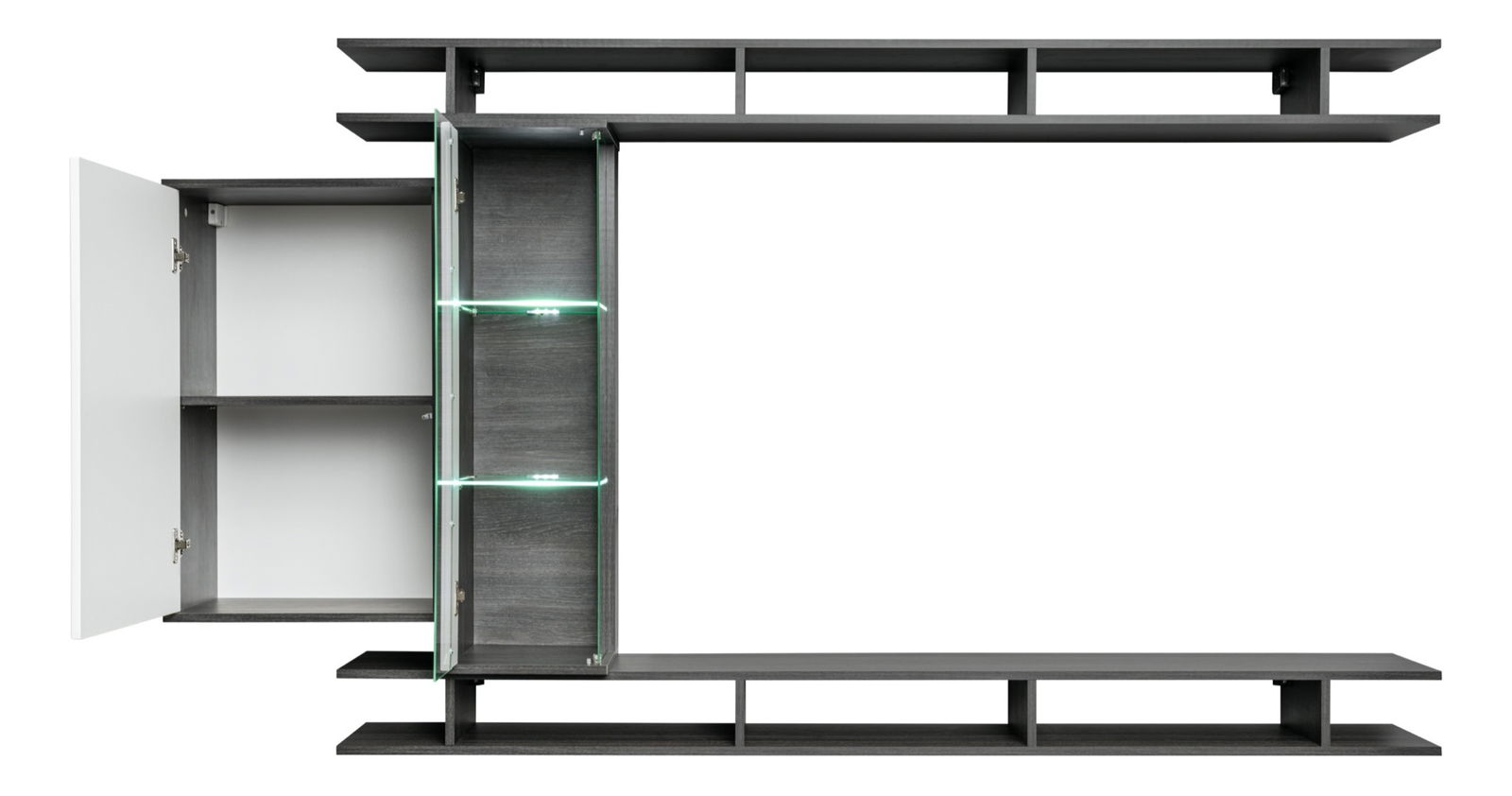 Závesná vitrína: 50/80/35 cm, Presklená vitrína: 30/130/35 cm, 2 x polica/horizontálna knižnica: 200/15/30 cm