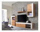 Obývacia stena Gladiator (dub wotan + biela) s výškou 180 cm a hĺbkou 39 cm je elegantná a štýlová. Poskytuje dostatok úložného priestoru v podobe RTV stolíka, závesnej jednodverovej vitríny, voľne stojacej vitríny a police. Závesná vitrína a voľne stojaca vitrína disponujú dvomi policami, čo robí obývaciu stenu praktickou na usporiadanie rôznych vecí. Materiál z ktorého je stena vyrobená je DTD laminovaná a hrúbka materiálu je 1,6 cm. Rozmery voľne stojacej vitríny sú 100x50x30 cm, závesnej vitríny 100x50x30 cm a RTV skrinky 39x39x150 cm. Šírka dvierok RTV skrinky je 100 cm a šírka otvoreného úložného priestoru je 50 cm. Rozmery závesnej police sú 17x17x90 cm a stena obsahuje uchytky. Stena sa dodáva v demonte.