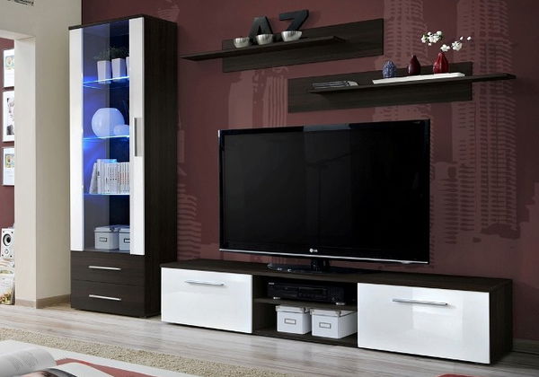 Obývacia stena Galino A je zložená zo štyroch prvkov a je vhodná do menších priestorov. Svojim dizajnom a jednoduchosťou však skvele zapadne do interiéru obývacej izby. TV skrinka má dvoje dvierka, na ktorých sú elegantné, 25 cm dlhé uchyty. V strednej časti je otvorený priestor na uloženie audio/video príslušenstva. Vysoká vitrína má sčasti presklené dvere a v dolnej časti dve zásuvky. Obsahuje tri sklenené, LED osvetlením podsvietené poličky. Samostatné poličky na stenu ponúkajú ďalší odkladací priestor na maličkosti. Presklené časti sú vyrobené z číreho tvrdeného skla.