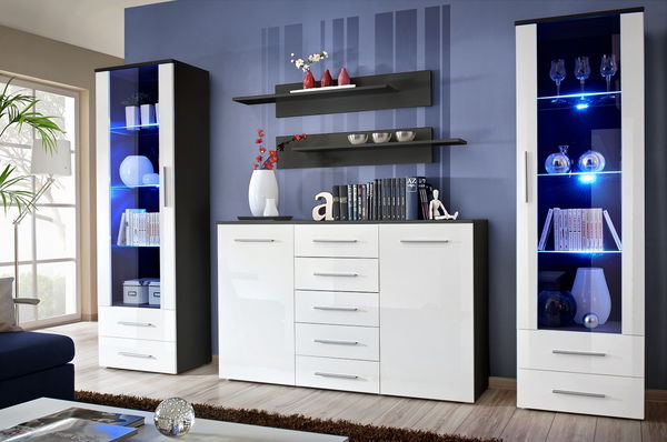 Obývacia stena Galino D má okrem dvoch vitrín a dvoch poličiek v zostave ešte priestrannú komodu. Po bokoch má dvierka s úložným priestorom a policami. V strede sa nachádza päť zásuviek. Vysoká vitrína má sčasti presklené dvere a v dolnej časti dve zásuvky. Obsahuje tri sklenené, LED osvetlením podsvietené poličky. Samostatné poličky na stenu ponúkajú ďalší odkladací priestor na maličkosti. Presklené časti sú vyrobené z číreho tvrdeného skla. Všetky fronty sú v lesku.