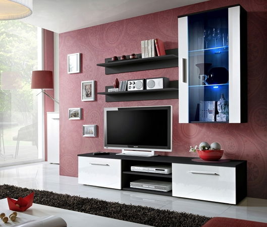 Obývacia stena Galino E je skromná rozmermi, ale zato ponúka dostatok úložného priestoru. TV stolík má po stranách priestor uzavretý dvierkami a v strede otvorené miesto na uloženie audio a video príslušenstva. Vitrína na stenu má presklené dvierka a je efektne podsvietená LED osvetlením. Vo vnútri sú dve sklenené poličky, ktoré sú vyrobené z tvrdeného skla. Odkladací priestor zväčšujú aj dve samostatne visiace poličky. Všetky fronty sú v lesku.