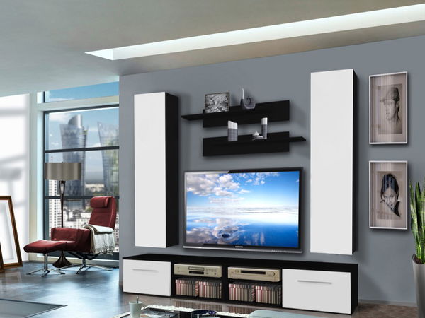 Jednoduchý a moderný dizajn obývacej steny je doplnený o systém push-click, ktorý je využitý pri skrine na stenu.