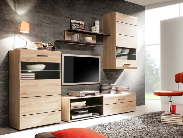 Kompletná obývacia stena s dvomi vitrínami, TV stolíkom s priestorom na audio/video a poličkou. Interiér vitrín je obsahuje doplnkové osvetlenie. V prípade potreby je možnosť dokúpiť si ďalšie produkty z modelovej rady.