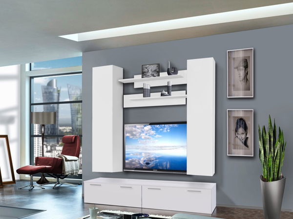 Jednoduchý a moderný dizajn obývacej steny je doplnený o systém push-click, ktorý je využitý pri skrine na stenu.