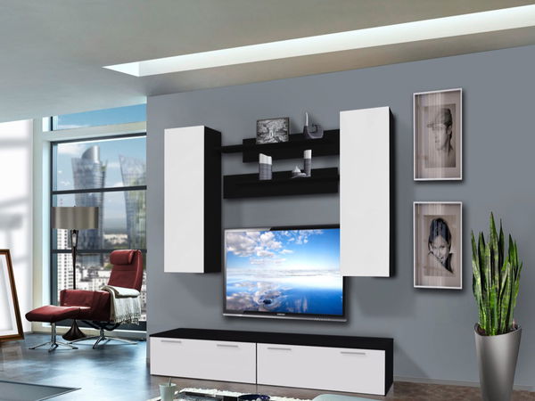 Jednoduchý a moderný dizajn obývacej steny je doplnený o systém push-click, ktorý je využitý pri skrine na stenu.