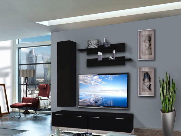 Jednoduchý a moderný dizajn obývacej steny je doplnený o systém push-click, ktorý je využitý pri skrine na stenu.