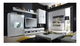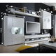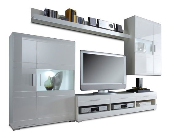 Nádherná obývacia stena dominantného luxusného charakteru s príťažlivým LED osvetlením za príplatok v dvoch vitrínach v modrom odtieni vyrobená z materiálu DTD laminovanej s ABS hranami s cieľom zaručiť maximálnu odolnosť a trvanlivosť. Zvislé tenké sivé úchyty. Prevedenie je extra vysoký biely lesk HG. Stena sa skladá z dvojdverovej vitríny s pravými čiastočne presklenými dvierkami, ďalej z dlhej poličky na stenu, TV stolíka so zásuvkami a 3 policami umiestenými vedľa seba na audio/video zariadenia a z dvojdverovej vitríny na stenu s ľavými čiastočne presklenými dverami.