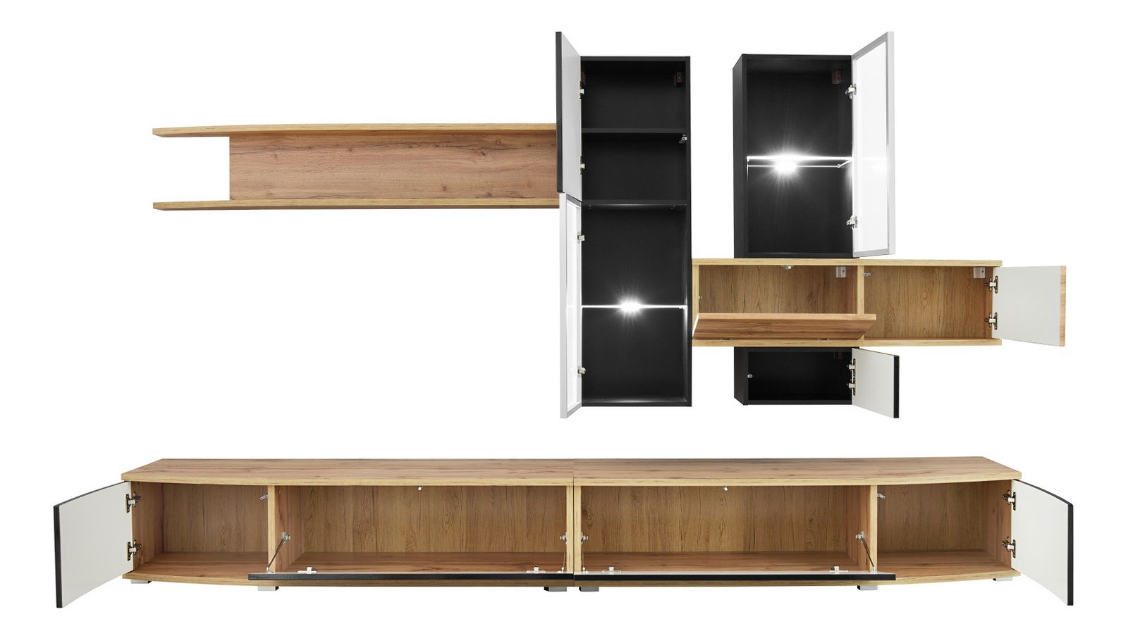 Obývacia stena Maire 29 WTS MH (dub wotan + čierna + strieborný hlinník) (s osvetlením)