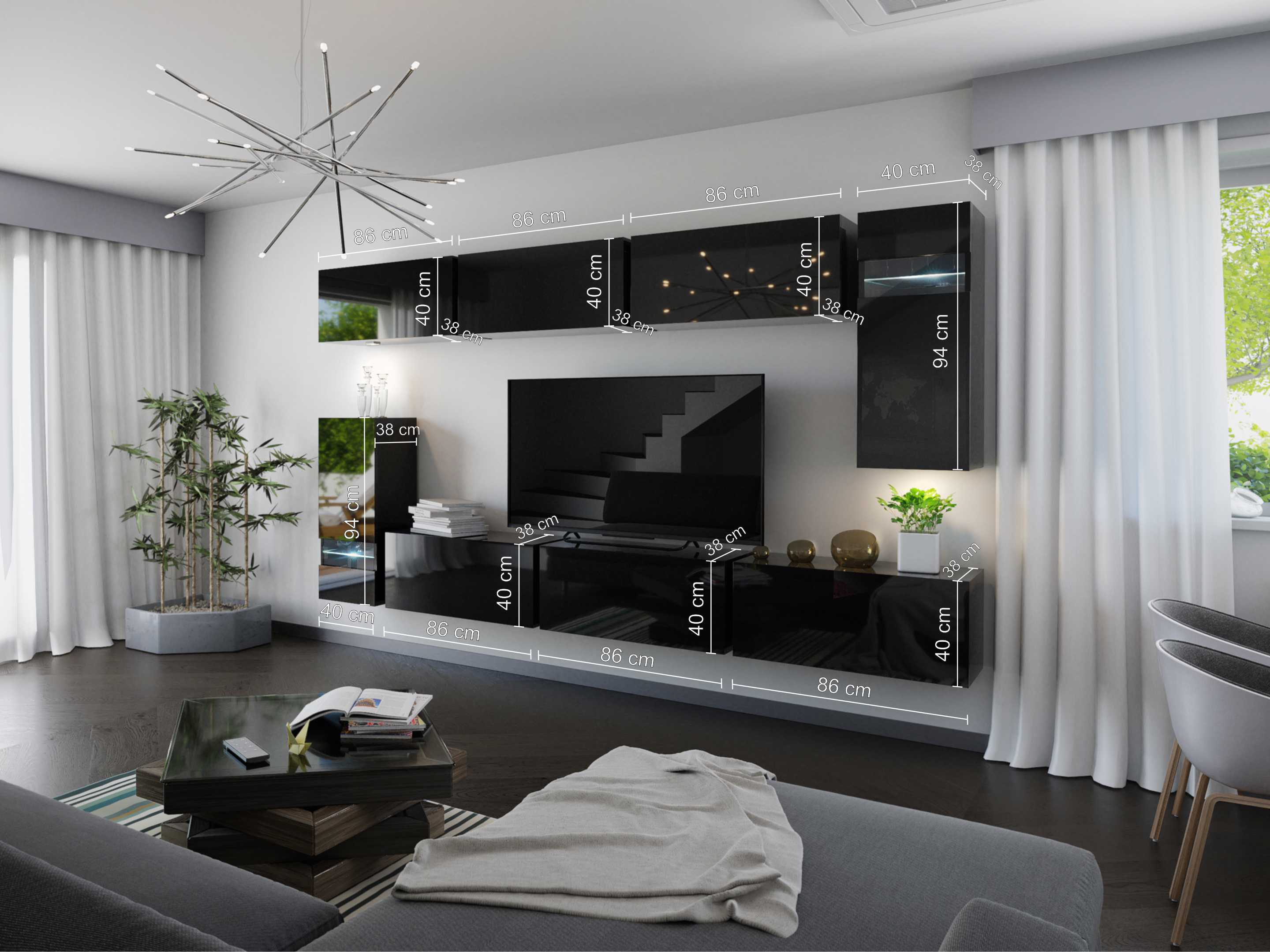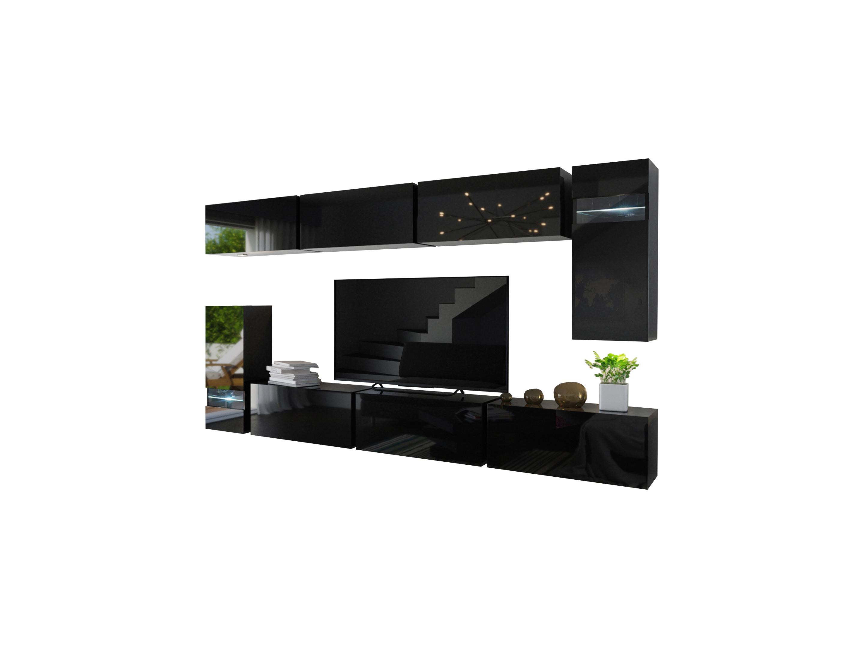 Obývacia stena Marmara (čierna + čierny lesk) je ideálnym riešením pre moderný interiér. Tento model nielen vyzerá dobre v interiéri, ale aj poskytuje dostatok miesta pre ukladanie vecí. Všetky dvierka sa otvárajú dômyselným PUSH-CLICK systémom, ktorý prispieva k pohodliu pri používaní. Obývacia stena sa dá umiestniť na stenu pre optické zväčšenie priestoru alebo na podlahu s nožičkami. Produkty sú dodávané v balíkoch E3 a E6 s rozmerom 92,5 x 8,2 x 42,6 cm a 101 x 8,2 x 42,6 cm. V každom balíku sú štyri strieborné plastové nožičky s rozmerom 2 x 6 x 4 cm. Lišta na uchytenie dolných skriniek nie je zahrnutá v produkte. Produkt má tiež možnosť doplnenia o LED osvetlenie pre moderný charakter.