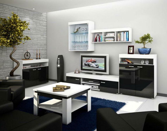 Moderná obývacia stena Sky vo farbe biela matná v kombinácii s čiernym leskom. Možnosť osvetlenia políc vitríny na modro alebo bielo.
