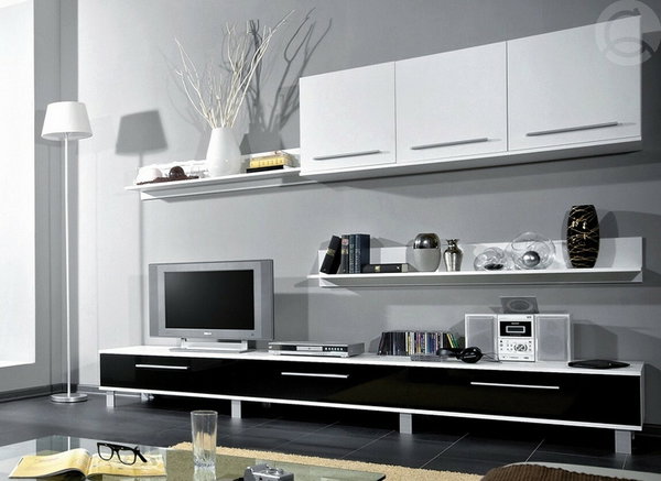 Obývacia stena minimalistického dizajnu určená pre tých, ktorí majú radi nové moderné trendy. Vyrába sa z kvalitného lamina doplnená o MDF prvky v čiernej farbe vo vysokom lesku. Zostava sa skladá z TV skrinky so zásuvkami (3x 90 x 33 x 48 cm), 2 políc (150 x 20 x 20 a 120 x 20 x 20 cm) a závesné skrinky otvárané do strán (3x 50 x 52 x 27 cm). Farebné prevedenie - čierna s bielou.