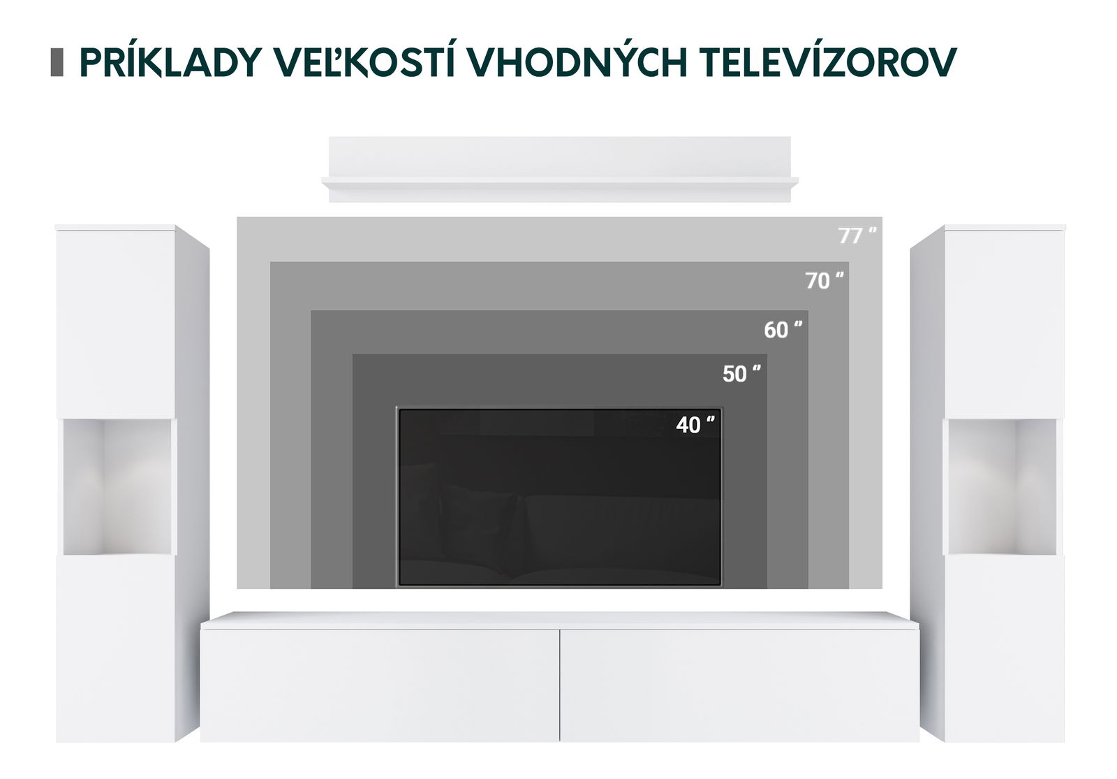 Vitrína: Šírka: 30 cm, výška: 130 cm, hĺbka: 33 cm, Závesná polica: šírka: 127 cm, výška: 18 cm, hĺbka: 12 cm, Skriňa RTV: šírka: 180 cm, výška: 30 cm, hĺbka: 33 cm