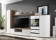 Moderná obývacia stena v kombinácii farby dreva a vysokého lesku pôsobí štýlovo a nadčasovo. Vľavo sa nachádza vysoká skrinka s dvomi dvierkami a za každými sa nachádzajú dve poličky. TV stolík má dve priehradky uzatvorené dvierkami, v strede zásuvku a nad ňou otvorený úložný priestor. Vitrína napravo má čiastočne presklené dvierka s čiernymi lesklými prvkami a podsvietenou poličkou. V pravej časti sú plné dvierka a za nimi dve poličky. V zostave sa nachádza ešte praktická polička na stenu s nosnosťou max. 10 kg. Všetky dvierka sa otvárajú systémom PUSH-CLICK, kedy stačí jemne zatlačiť pre otvorenie alebo opätovné zatvorenie dvierok. Zásuvky majú nenápadné vyfrézované uchyty. Dosky sú hrubé 22 cm.