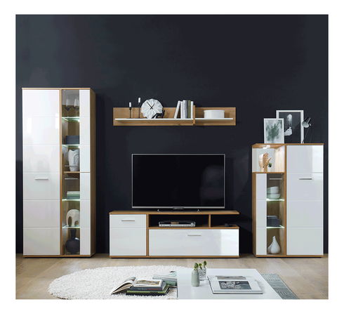 Zostava obsahuje policu, vitrínu, vysokú vitrínu, TV stolík
