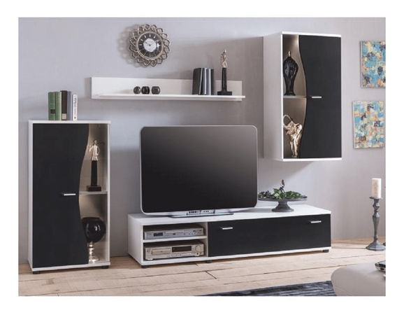 Obývacia stena, ktorá vás zaujme eleganciou a neobyčajným dizajnom dvierok vitrín. Skladá sa z vitríny, ktorá má zaujímavé zaoblené dvierka, TV stolíka, vitríny na stenu a širokej police. Farebné prevedenie obývacej steny je biela v kombinácii s čiernou farbou.