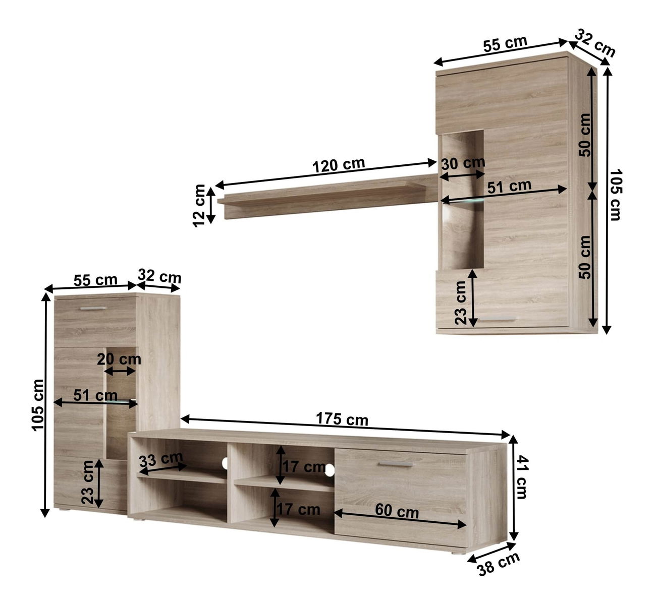 Obývacia stena s LED Frantal (dub sonoma) je skvelým doplnkom pre vašu obývačku, ktorý ju nielen rozžiari, ale aj vytvorí pohodové a útulné miesto pre vás a vašu rodinu. S výškou 190 cm, šírkou 230 cm a hĺbkou 38.5 cm poskytuje dostatok priestoru na veci, ktoré chcete mať stále na očiach alebo skryté. Táto obývacia stena disponuje LED osvetlením s podfarbením studená biela, ktoré dodá celej miestnosti noblesu a eleganciu. Vyrobená je z kvalitnej DTD fólie a má elegantné farebné prevedenie dub sonoma. Svojim zložením z RTV stolíka, skrinky, závesnej a stojacej vitríny ponúka dostatok úložného priestoru pre všetky vaše potreby. Sklenená časť oživená LED podsvietením dodáva tomuto kusu nábytku jedinečný vzhľad. Táto obývacia stena bude určite vynikajúcim doplnkom pre každú obývačku.