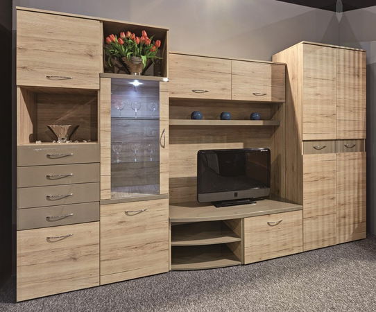 Obývacia stena vo farbe prírodného dreva dub sanremo, prinesie nádych prírody do Vášho obydlia. Je vyrobená z kvalitnej LTD s prvkami MDF. Do vitríny je možné si priobjednať efektné osvetlenie sklenených poličiek. To navodí príjemnú atmosféru celého priestoru a dodá exkluzivitu nábytku.