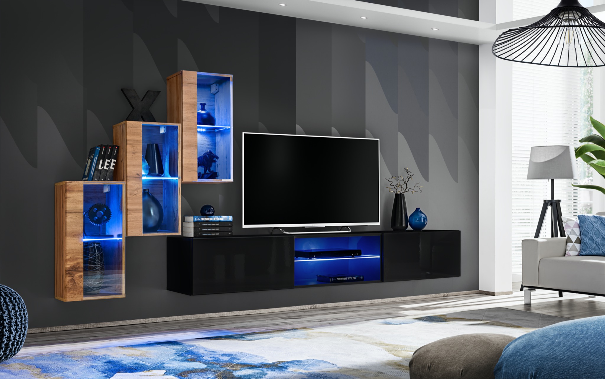Elegancia a moderný dizajn, takto sa vám predstavuje rad Switch 22. Výhodou obývacej steny je, že si ju môžete v priestore rozložiť podľa vašich predstáv alebo sa inšpirovať prevedením aké vidíte na obrázku. Atraktívnym prvkom je vnútorné podsvietenie troch vitrín a TV stolíka. Vitrína môže poslúžiť napríklad ako barová skrinka. Otváranie dverí je systémom push-click. Stačí slabšie zatlačiť na dvierka pre otvorenie a opätovné zatvorenie.