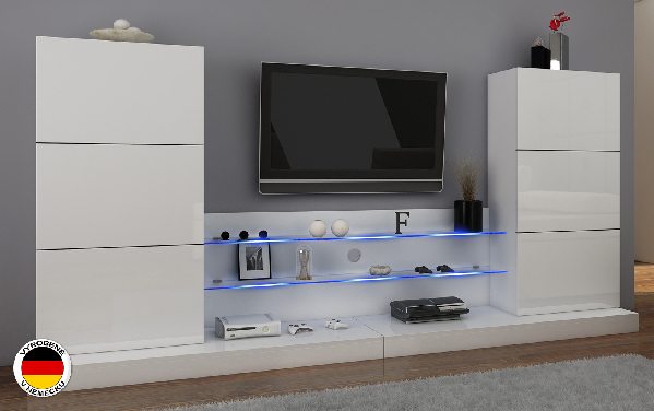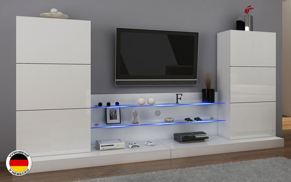 Vysoko moderná obývacia stena Ulm s jemným dizajnom spraví z Vašej obývacej izby moderný priestor. Vysoko lesklé fronty dodávajú celej zostave exkluzivitu. Navyše si k skleneným poličkám môžete priobjednať modré LED osvetlenie, ktoré navodí príjemnú atmosféru celého priestoru. Obývacia stena je vyrobená v Nemecku z tých najkvalitnejších materiálov.