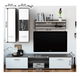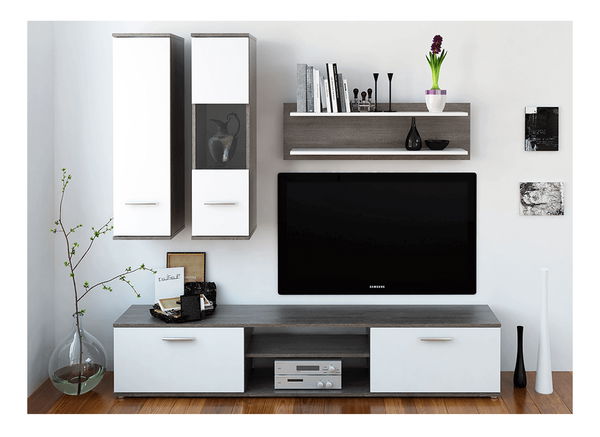 Moderná obývacia stena zaujme čistými tvarmi, jednoduchým dizajnom a funkčnosťou. Skladá sa z praktického TV stolíka, ktorý má dve dvierka a uprostred priestor pre AV zariadenia, dve poličky pre vaše dekorácie, skrinku na stenu a vitrínu na stenu. Farebné prevedenie obývacej steny je dub truflový a biela.