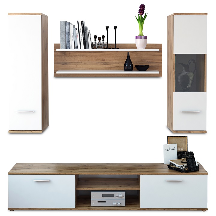 Moderná a praktická obývacia stena s jednoduchším, ale všestranným dizajnom, ktorý sa dá kombinovať s inými prvkami. Komponenty obývacej steny sú: Tv stolík, polička na stenu, skrinka na stenu a vitrína na stenu. Komponenty sú vyrobené z fóliovanej drevotriesky. Farebné prevedenie obývacej steny je dub wotan v kombinácii s bielou.