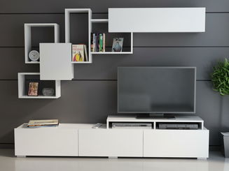 Moderná obývacia stena má pôsobiť vzdušne a má zaberať maximálne 2/3 dĺžky steny. Najbežnejším typom modernej TV steny je tkz. zábavné centrum. Takáto stena dáva do popredia televízor, a tak je najdôležitejším prvkom celej zostavy práve TV skrinka alebo TV panel, na ktorom je televízor zavesený. Hlavným posolstvom moderného nábytku je hravá jednoduchosť. Takéto zábavné centrá obsahujú rôzne možnosti úložného priestoru a často ponúkajú kombináciu zásuviek, políc a uzavretých priečinkov vo vitrínach, skrinkách a regáloch. Príjemnú večernú atmosféru v obývačke docielite zakúpením skriniek alebo políc so zabudovaným úsporným LED osvetlením. Väčšinou bývajú osvetlené sklenené poličky vo vitríne, ale môžete si zvoliť aj bodové svetlo umiestnené v hornej poličke.
