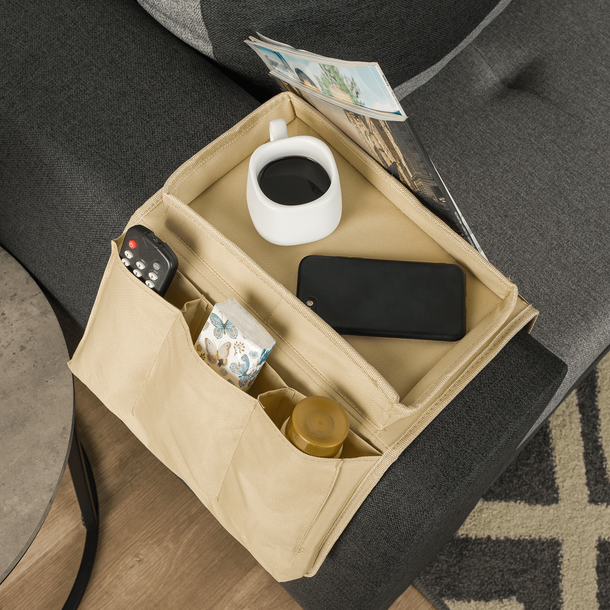 Odkladacia podložka na sedačku Irena (béžová) je praktický doplnok pre každého, kto miluje pohodlie a organizovanosť. Táto jednoduchá skladacia podložka na sedadlo alebo kreslo má dostatočne veľkú vrchnú odkladaciu plochu šírky 18,5 cm a výšky 4 cm, ktorá umožňuje uskladniť drobnosti, ako sú mobilné telefóny, diaľkové ovládače alebo čítacie okuliare. Okrem toho má veľkú kapsu a tri menšie priehradky, ktoré sa hodia na uskladnenie ďalších vecí. Podložka je vyrobená z polyesteru a má nosnosť 5 kg. Je dodávaná v demonte, čo umožňuje ľahké skladovanie a prenášanie. Odkladacia podložka na sedačku Irena (béžová) je ideálnou voľbou pre každého, kto chce mať všetko potrebné stále po ruke a zároveň si užiť maximálne pohodlie.