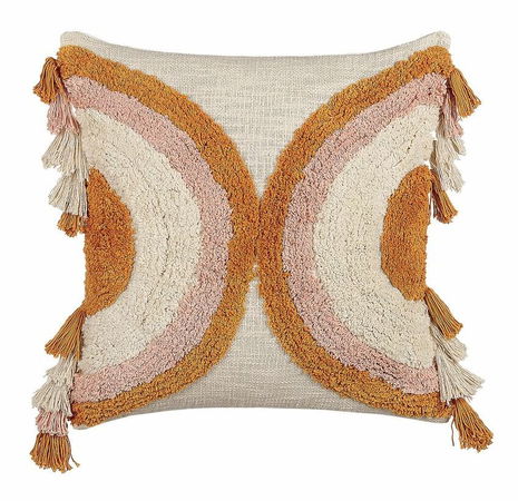 Skrášlite interiér svojej obývačky s týmto vankúšom, ktorý jej dodá útulný a príjemný vzhľad. Geometrický vzor inšpirovaný dúhou s jedinečnou textúrou a strapcami, z neho robí pútavú dekoráciu. Vankúš má bavlnený poťah, mäkkú výplň a zapínanie na zips.
