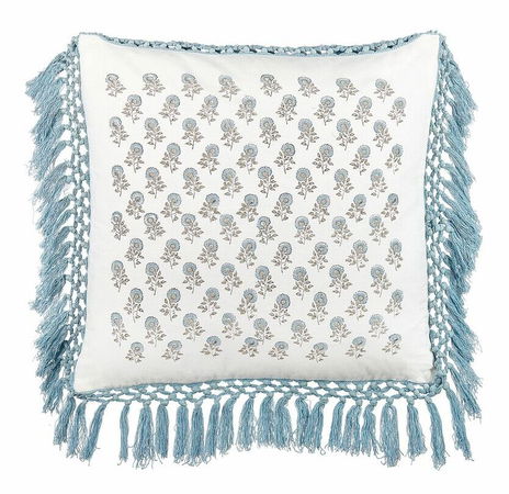 Urobte zo svojho interiéru očarujúce miesto a ozdobte ho týmto dekoratívnym vankúšom v romantickom štýle. Bavlnená obliečka s jemným vzorom kvetov, ktorá bola vyrobená ručne pomocou techniky blokovej tlače, je ozdobená modrými strapcami. Mäkká výplň z kvalitného polyesteru sa dá ľahko vybrať vďaka praktickému zipsu.
