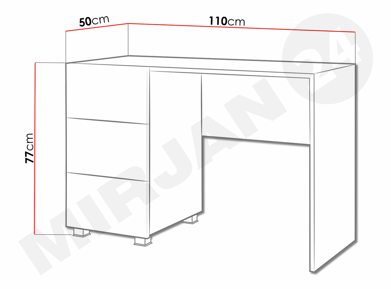 PC stolík je moderný s priestrannou pracovnou doskou a vstavanými troma zásuvkami bez úchytiek.