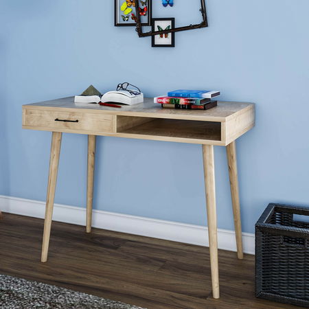 PC stolík - Carala je praktický a moderný kus nábytku, ktorý je ideálny pre vašu domácu kanceláriu alebo pracovný priestor. S výškou 79 cm, šírkou 105 cm a hĺbkou 55 cm poskytuje dostatok miesta pre váš osobný počítač, monitor, klávesnicu a ďalšie príslušenstvo. Vyrobený z kvalitnej 100% melamínovej dosky, tento stolík je odolný voči odreninám a škrabancom a je jednoduchý na čistenie. Svojim dubovým prevedením pridáva do vašej miestnosti prírodný a elegantný vzhľad. S PC stolíkom Carala získate praktický a štýlový nábytok, ktorý vám pomôže udržať si organizované a efektívne pracovné prostredie.