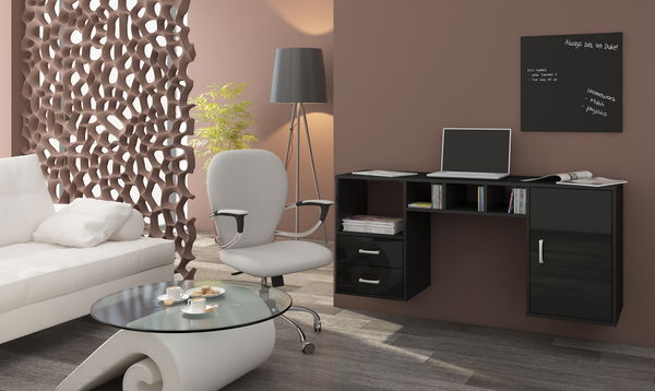 Praktický PC stolík Hanger má moderný a čistý dizajn. Je unikátny v spôsobe uchytenia na stenu pomocou piatich úchytiek. Na pravej strane sa nachádza skrinka, na ľavej strane dve zásuvky a odkladací priestor na knihy alebo dokumenty a uprostred stolíka sú tri menšie poličky na drobnosti. Farebné prevedenie PC stolíka je čierna farba v kombinácii s čiernym leskom.