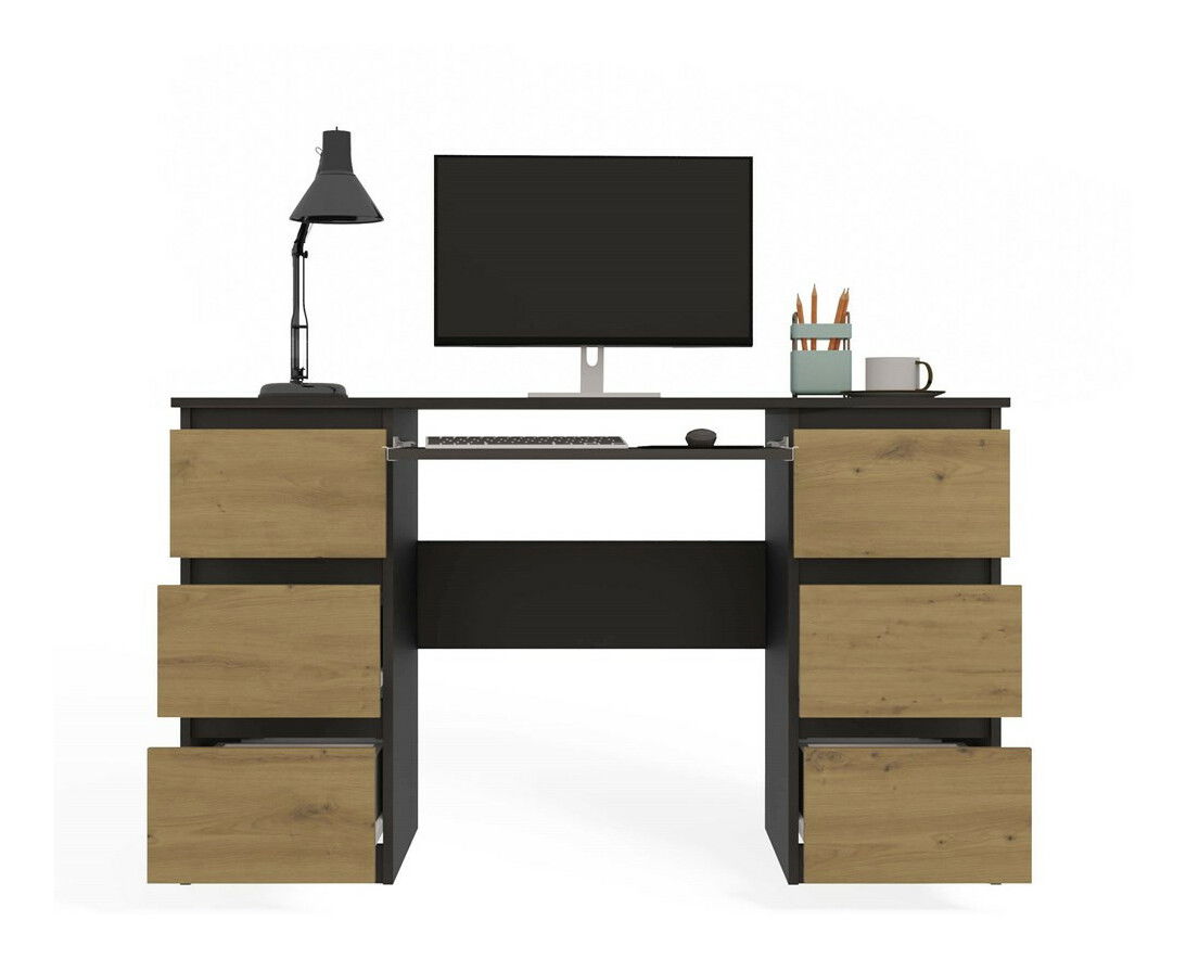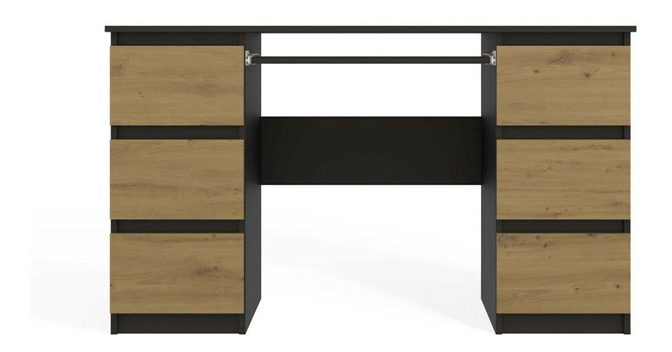 PC stolík Kwazulu 1 je praktický a estetický nábytok, ktorý sa skvele hodí do domácnosti, kancelárie alebo študentskej izby. S modernou farebnou kombináciou antracitového korpusu a dubu artisan ponúka nielen štýlový vzhľad, ale aj vysokú funkčnosť. Šesť priestranných zásuviek zabezpečuje dostatok miesta na dokumenty a kancelárske potreby, zatiaľ čo vysúvacia polica na klávesnicu prispieva k ergonomickému usporiadaniu pracovného priestoru. Tento stolík je navrhnutý tak, aby odolal každodennej prevádzke a stal sa neodmysliteľnou súčasťou vašej pracovnej zóny.