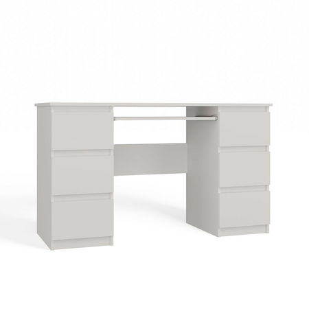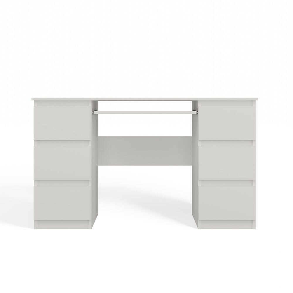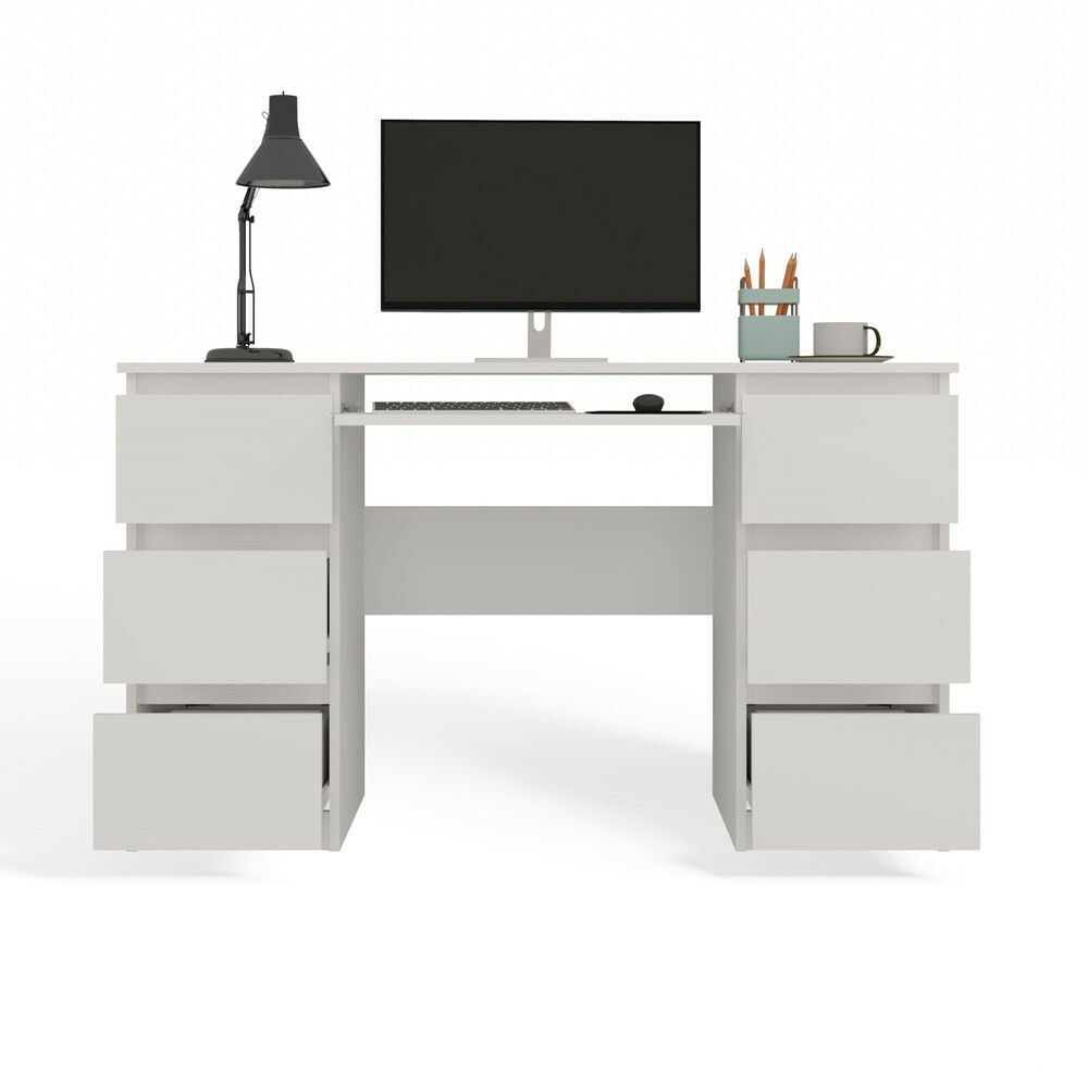 ZobraziťPC stolík Kwazulu 1 v bielej matnej farbe je ideálnym riešením pre moderné aj klasické interiéry. S jeho minimalistickým dizajnom a šiestimi priestrannými zásuvkami ponúka dostatok úložného priestoru na dokumenty a kancelárske potreby. Vysúvacia polica na klávesnicu zabezpečuje ergonomické pracovné prostredie, zatiaľ čo stabilná konštrukcia z laminovanej drevotriesky zaručuje odolnosť voči poškriabaniu a jednoduchú údržbu. Tento praktický nábytok je skvelou voľbou do domácich kancelárií, študentských izieb či pracovných priestorov.