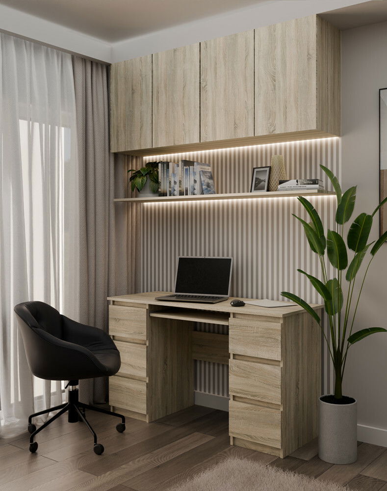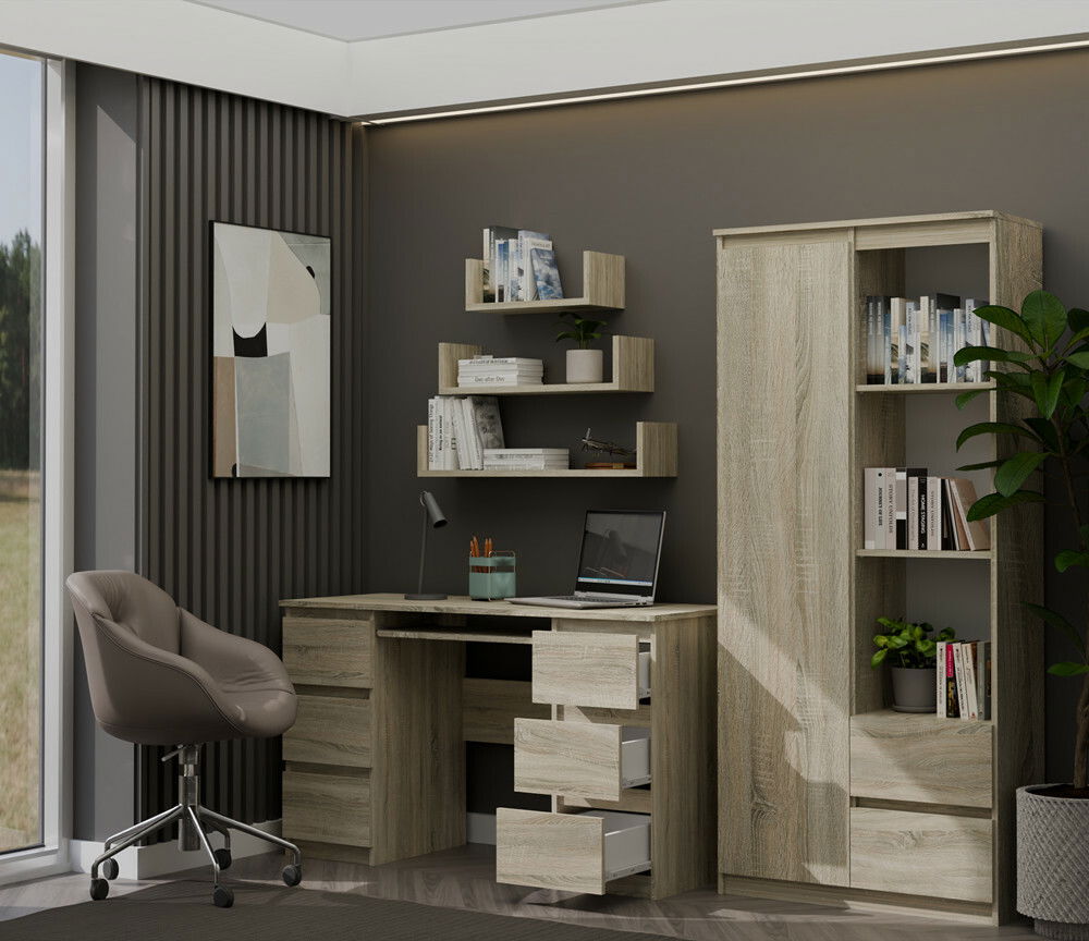 PC stolík Kwazulu 1 v elegantnej farbe dub sonoma je ideálnym riešením pre každú pracovnú plochu, či už v domácnosti, kancelárii alebo študentskej izbe. Jeho moderný a minimalistický dizajn s bezúchytkovými frontami sa skvele hodí do rôznych interiérov. S šiestimi priestrannými zásuvkami ponúka dostatok miesta na uskladnenie dokumentov a kancelárskych potrieb, zatiaľ čo vysúvacia polica na klávesnicu zabezpečuje ergonomické používanie. Stabilná konštrukcia z laminovanej drevotriesky je odolná voči poškriabaniu a ľahko sa udržuje, čo zaručuje dlhú životnosť tohto praktického nábytku.