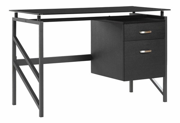 Kompaktný stôl do domácej kancelárie, ktorý zapadne do každého industriálne alebo minimalisticky ladeného priestoru. Pevný kovový rám v čiernej farbe poskytuje stabilný základ pre všetko príslušenstvo a vybavenie pracovne, zatiaľ čo vrchná doska z tvrdeného skla dodáva stolu čistý a vzdušný charakter. Dve priestranné zásuvky ponúkajú dostatok miesta na zošity, perá a iné školské potreby.