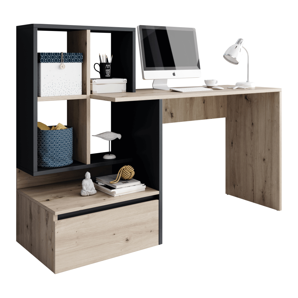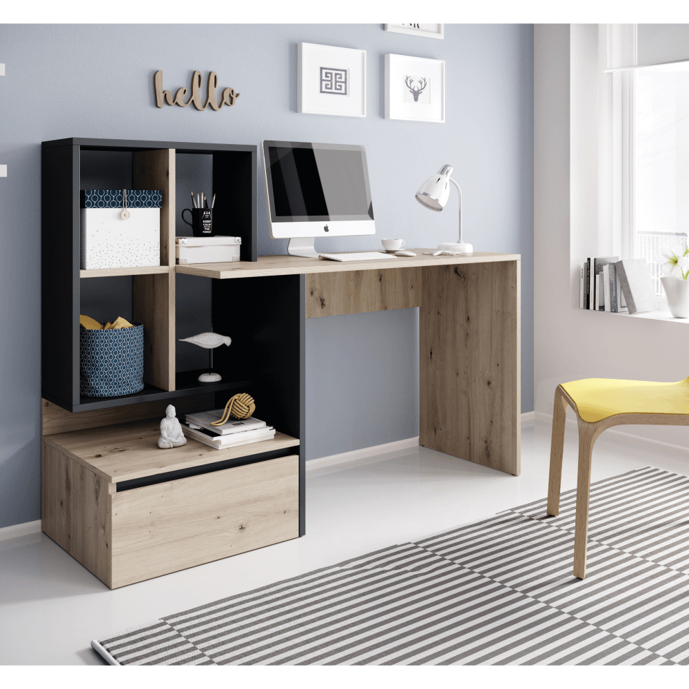 Potrebujete pri vašej práci súkromie? Viete sa najlepšie sústrediť, keď máte vlastné miestečko na prácu? Venujete sa jej niekoľko hodín denne? Práve preto potrebujete dokonalý pracovný stôl. Do pozornosti dávame PC stôl Nurvo, ktorý si zamilujete nielen vy, ale aj vaše deti pri vypracovávaní úloh do školy. Nurvo je multifunkčný stôl, ktorý sa hrdí moderným dizajnom. Ponúka úložný priestor v podobe zásuvky a otvorených poličiek. Moderná kombinácia farieb dub artisan/grafit je perfektnou voľbou do akéhokoľvek interiéru. Pracujte v pohodlí vášho domova s týmto nadčasovým PC stolom.