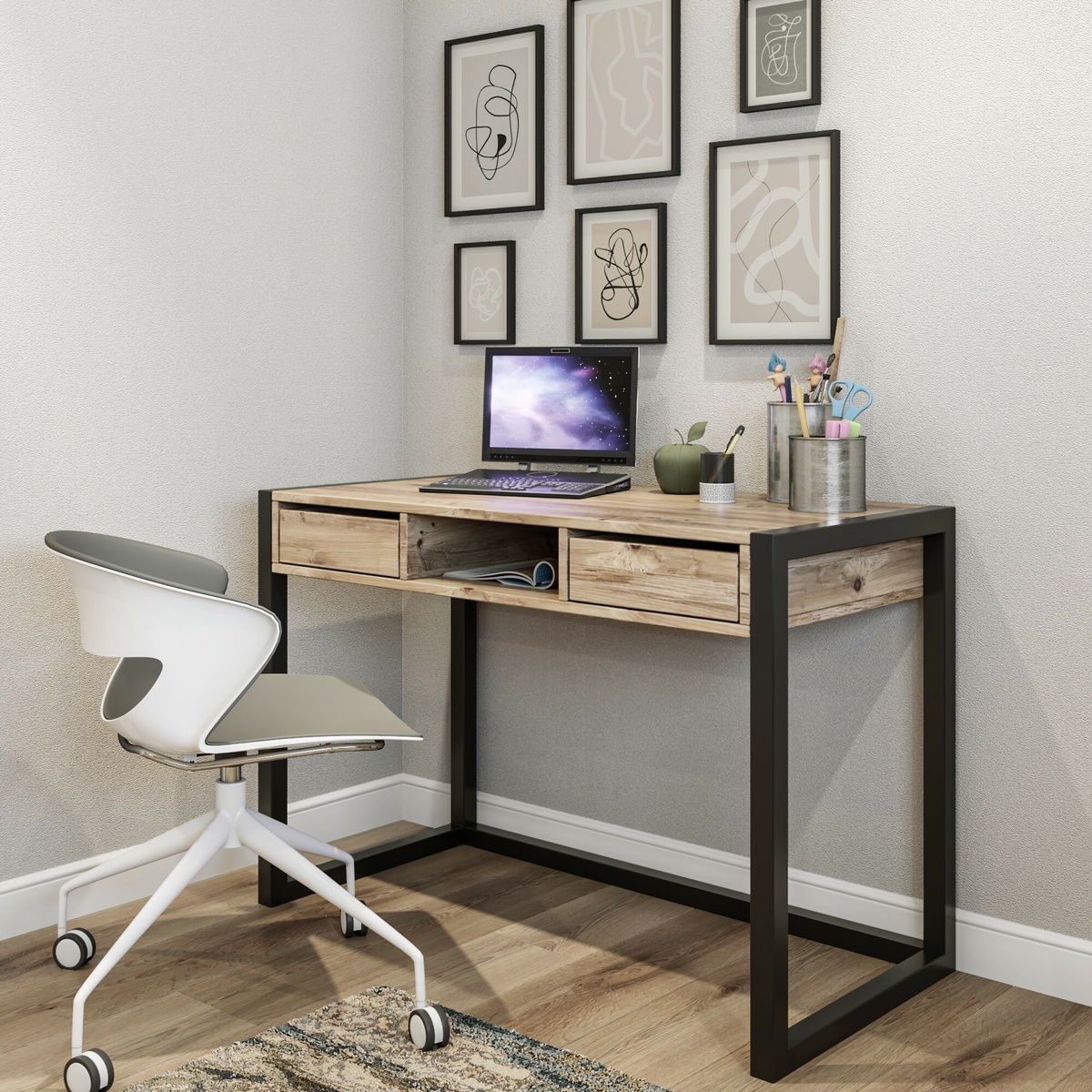 PC stolík Ouge s výškou 77 cm, šírkou 105 cm a hĺbkou 55 cm je praktickým a štýlovým doplnkom pre váš osobný počítač. Vyrobený z 100% melamínovej dosky s Atlantickou borovicou v elegantnej čiernej farbe, tento stolík ponúka dostatok priestoru na umiestnenie vášho PC monitora, klávesnice a myši. Jeho pevná konštrukcia a robustný dizajn zaručujú stabilitu a dlhú životnosť. S PC stolíkom Ouge si môžete vytvoriť pohodlné pracovné prostredie doma alebo v kancelárii, a to v štýle.