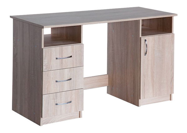 Jednofarebný PC stolík s kompaktnými rozmermi je ideálny do menších pracovní. Na ľavej strane stolíka sa nad sebou nachádzajú 3 hlboké zásuvky a nad nimi je umiestnená otvorená polička. Na strane pravej sa nachádza skrinka s jednými dvierkami a nad nimi je umiestnená otvorená polička. Kvalitu spracovania potvrdzuje použitie odolných ABS hrán na všetkých miestach rezu dosky a vybavenie stolíka odolnými kovovými úchytmi. Farebné prevedenie na výber: jelša, orech, buk, dub sonoma.