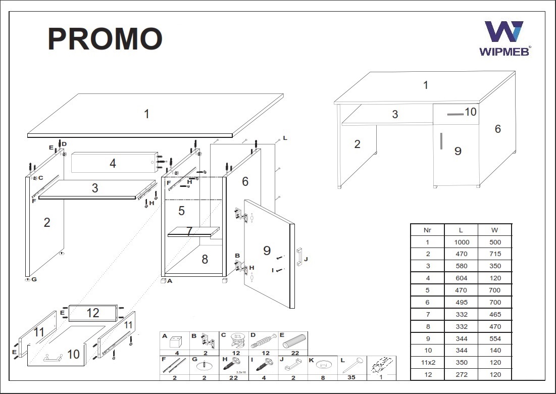 Jednoduchý jednofarebný PC stolík s výsuvnou poličkou pre klávesnicu, ktorá je umiestnená na ľavej strane. Svojimi kompaktnými rozmermi je ideálny do menších pracovní. Na pravej strane sa pod hornou doskou nachádza zásuvka a pod ňou je umiestnená skrinka s jednými dvierkami. Kvalitu spracovania potvrdzuje použitie odolných ABS hrán na všetkých miestach rezu dosky a vybavenie stolíka odolnými kovovými úchytkami. Farebné prevedenie na výber: jelša, orech, buk, dub sonoma.