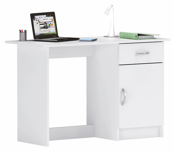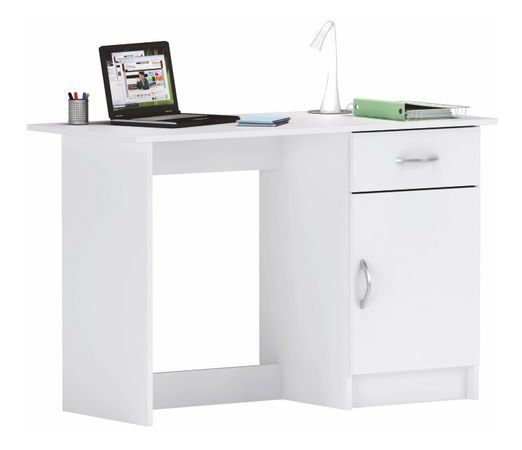 Praktický PC stolík v bielej farbe s jednou skrinkou s dvierkami a zásuvkou na pravej strane. Oválne sivé úchyty.