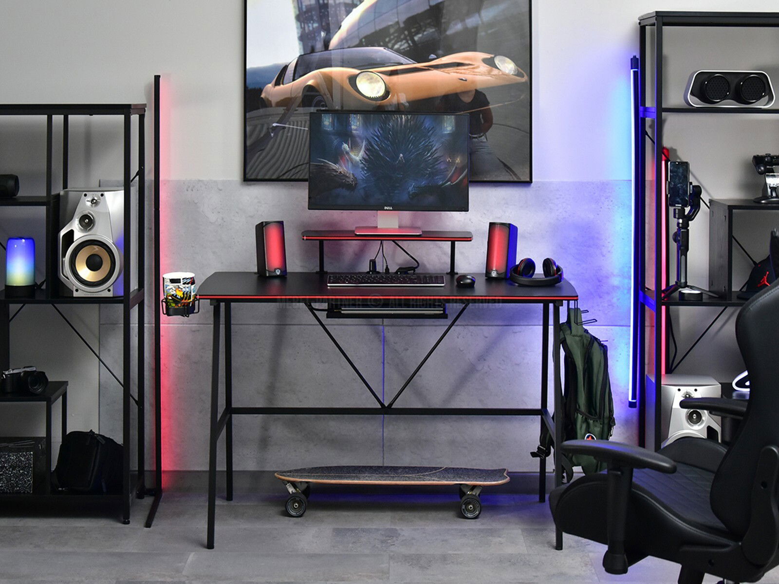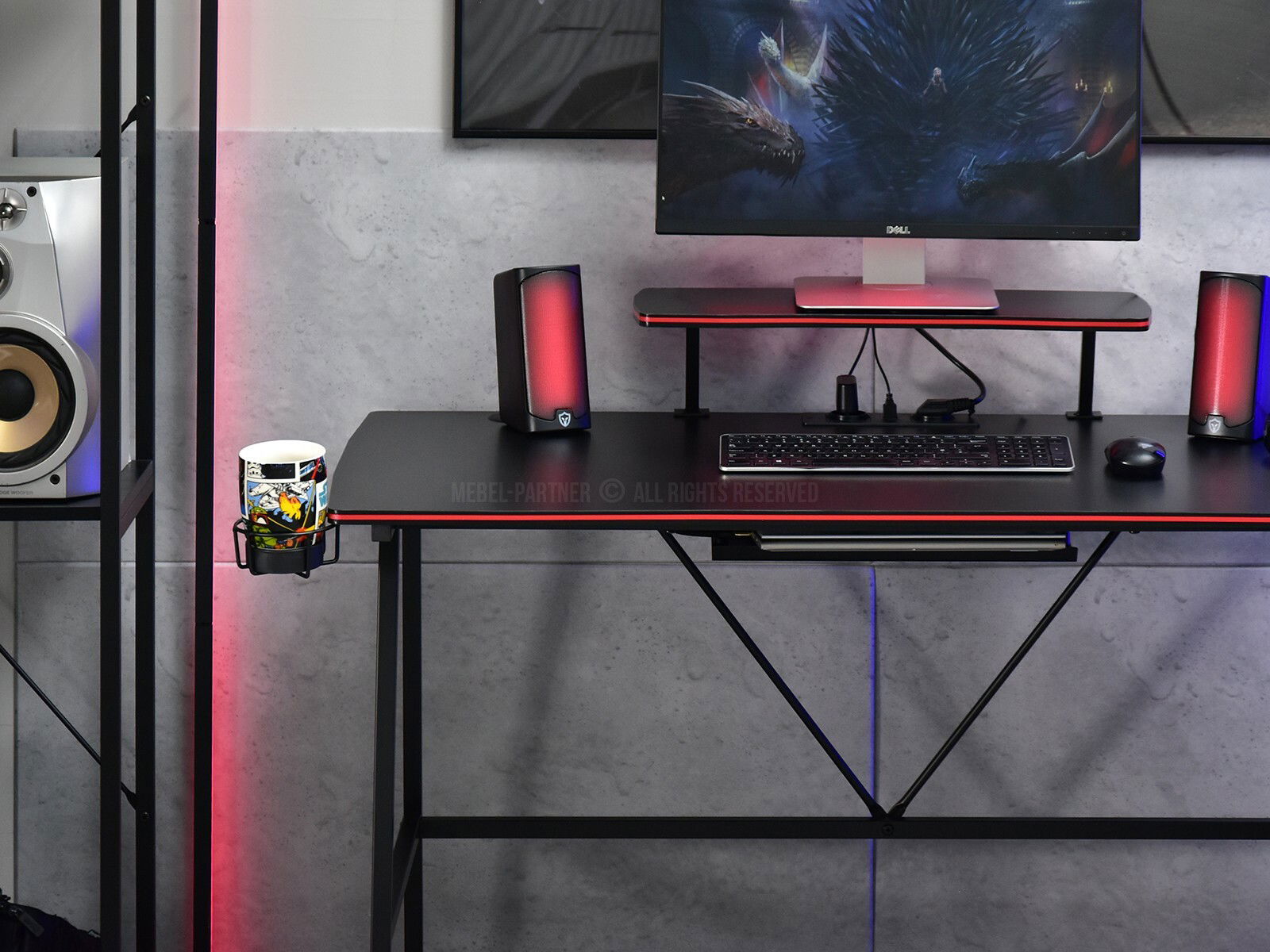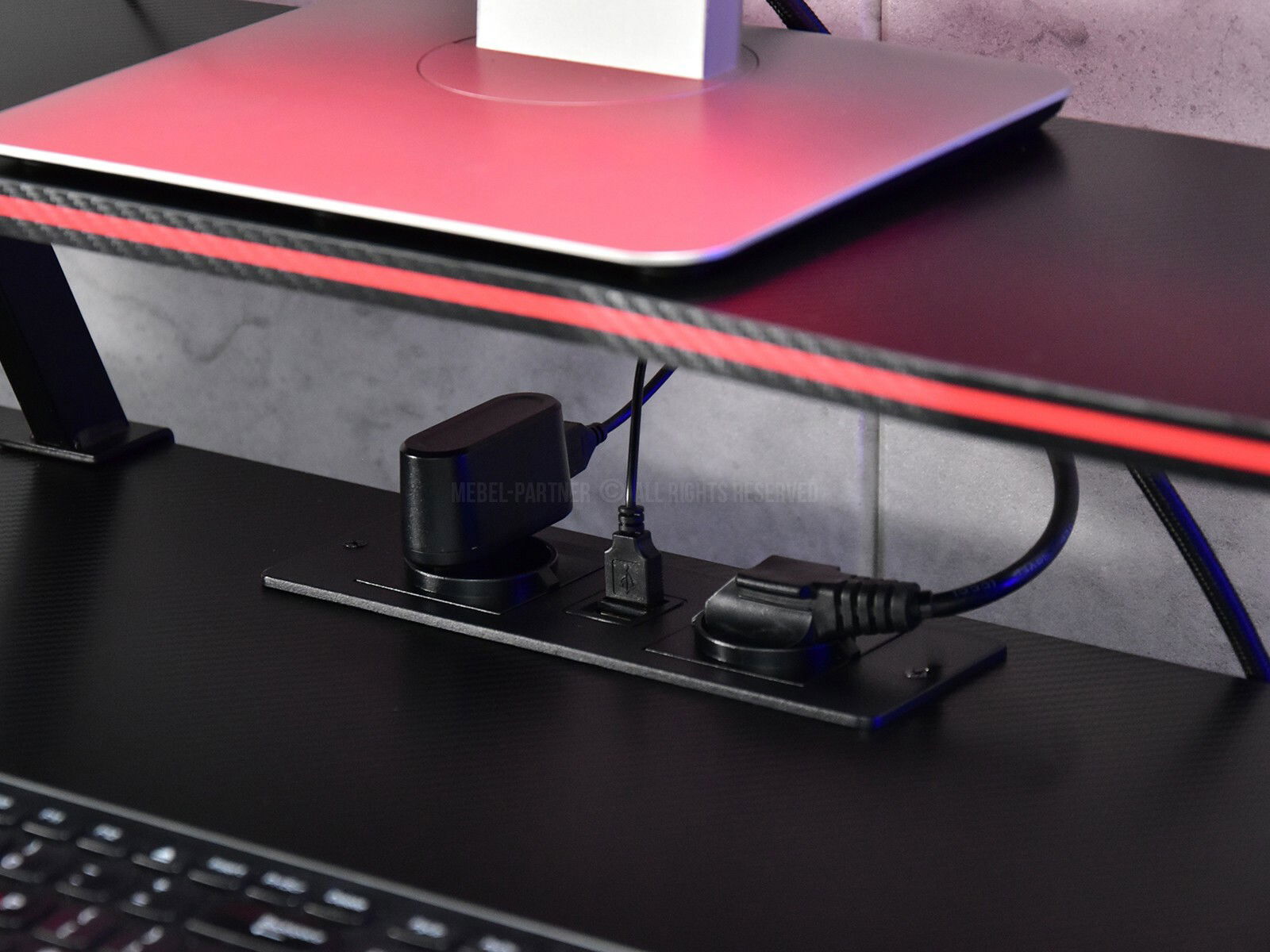 obdĺžniková doska, polica s predĺžením, 2 napájacie zásuvky, USB, držiak na poháre, 2 vešiaky, káblová priechodka, organizér káblov