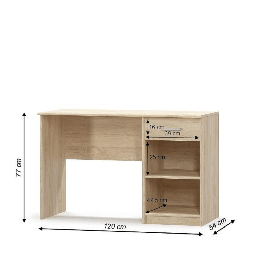 PC stolík Thornham 1S s výškou 77 cm a hĺbkou 54 cm je skvelým doplnkom pre Vaše deti. Tento stolík má moderný dizajn a v pravej časti je zásuvka a dve otvorené poličky na odkladanie písacích potrieb, zošitov alebo knižiek. Farebné prevedenie tohto PC stolíka je dub sonoma a je vyrobený z DTD laminovanej dosky (16 mm). Zásuvka je veľkosti 16 x 39 x 49,5 cm. Rozmery stolíka sú 120x54x77 cm a je dodávaný v demonte.