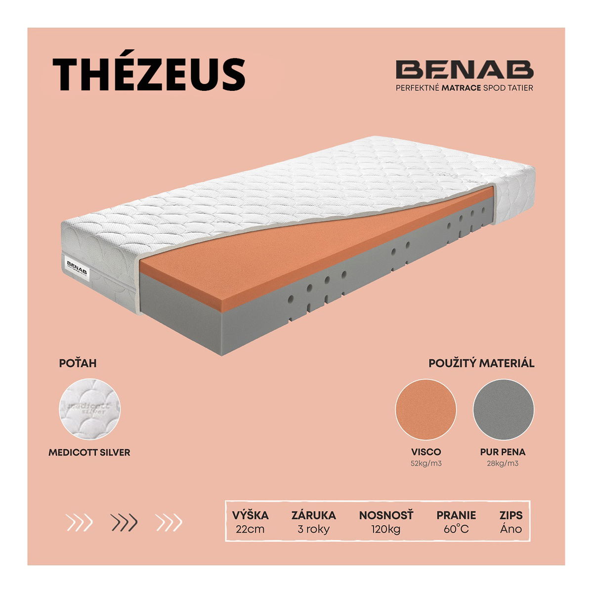 Na dotyk príjemný poťah, ktorý sa dokonale hodí pre ľudí s citlivou pokožkou. Svojím zložením a účinnou zložkou medicott zabraňuje tvorbe a usadzovaniu roztočov a plesní. Poťah má antibakteriálne účinky, ktoré sú dosiahnuté bez prídavku chemických látok. Pri pravidelnej údržbe má poťah dlhodobý účinok. Obsahuje kvalitný a certifikovaný OEKO-TEX standard. Poťah je odzipsovateľný a prateľný do 60 stupňov.