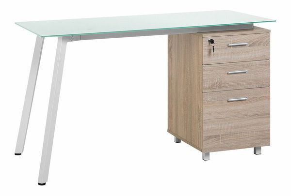 Vďaka tomuto elegantnému písaciemu stolu si môžete vytvoriť pracovný kútik v akomkoľvek interiéri zariadenom v modernom, minimalistickom alebo súčasnom štýle. Nápaditá kombinácia sklenenej vrchnej dosky a drevenej konštrukcie umiestnenej na kovovom ráme vytvára dojem otvorenosti a priestrannosti. Tento stôl je vybavený skrinkou s tromi zásuvkami, pričom jednu z nich možno uzamknúť kľúčom, takže ponúka dostatok úložného priestoru na usporiadanie všetkých vašich písacích potrieb, dokumentov a iného kancelárskeho vybavenia.