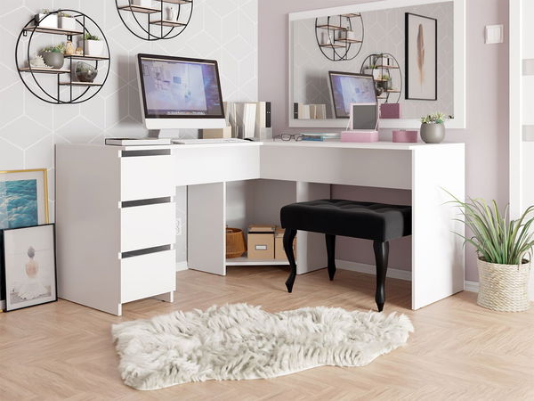 Písací stôl Onosi je ideálnou voľbou pre tých, ktorí hľadajú pohodlie a štýl. Rohový stôl Onosi je príkladom dobrého dizajnu. V kancelárii vám stôl Onosi poskytne veľa pohodlného pracovného priestoru, zatiaľ čo v spálni sa dá na jednej strane použiť ako toaletný stolík a na druhej strane ako pracovný priestor domácej kancelárie. Rohový stôl je tiež dokonalým riešením do študentskej izby. Jedna strana poskytne priestor pre počítač a druhá strana bude vhodná na praktické domáce úlohy. Písací stôl bol navyše vybavený zásuvkami, ktoré poskytnú veľa úložného priestoru. V spodnej, rohovej časti nábytku je priestranná polica. Rozmery: šírka: 142 cm, výška: 74 cm, hĺbka: 142 cm Prevedenie: drevotrieska s hrúbkou 16 mm, zadná stena: HDF v bielej farbe, guľôčkové vedenie L-342 v zásuvkách, žiadne držadlá, vrcholy spojené s doskou 120x20x3 Možnosť nákupu produktov z ponuky: Čalúnená lavica Sylwani 60 Zrkadlo Naris N16 Záruka: 24 mesiacov