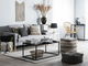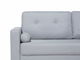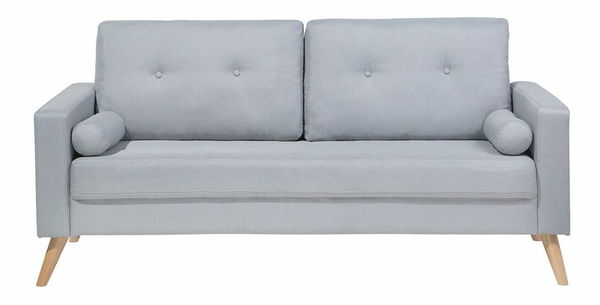 Pohovka so svetlosivým čalúnením dodá akémukoľvek interiéru nový vzhľad. Hranatý dizajn je zjemnený hrubými vankúšmi s ozdobnými gombíkmi a dvomi podhlavníkmi. Vankúše so snímateľným poťahom sa dajú jednoducho vyčistiť a drevené nohy pohovke dodávajú nádych retro štýlu. Táto dvojmiestna pohovke je vhodná do interiérov zariadených v modernom, eklektickom alebo vintage štýle.