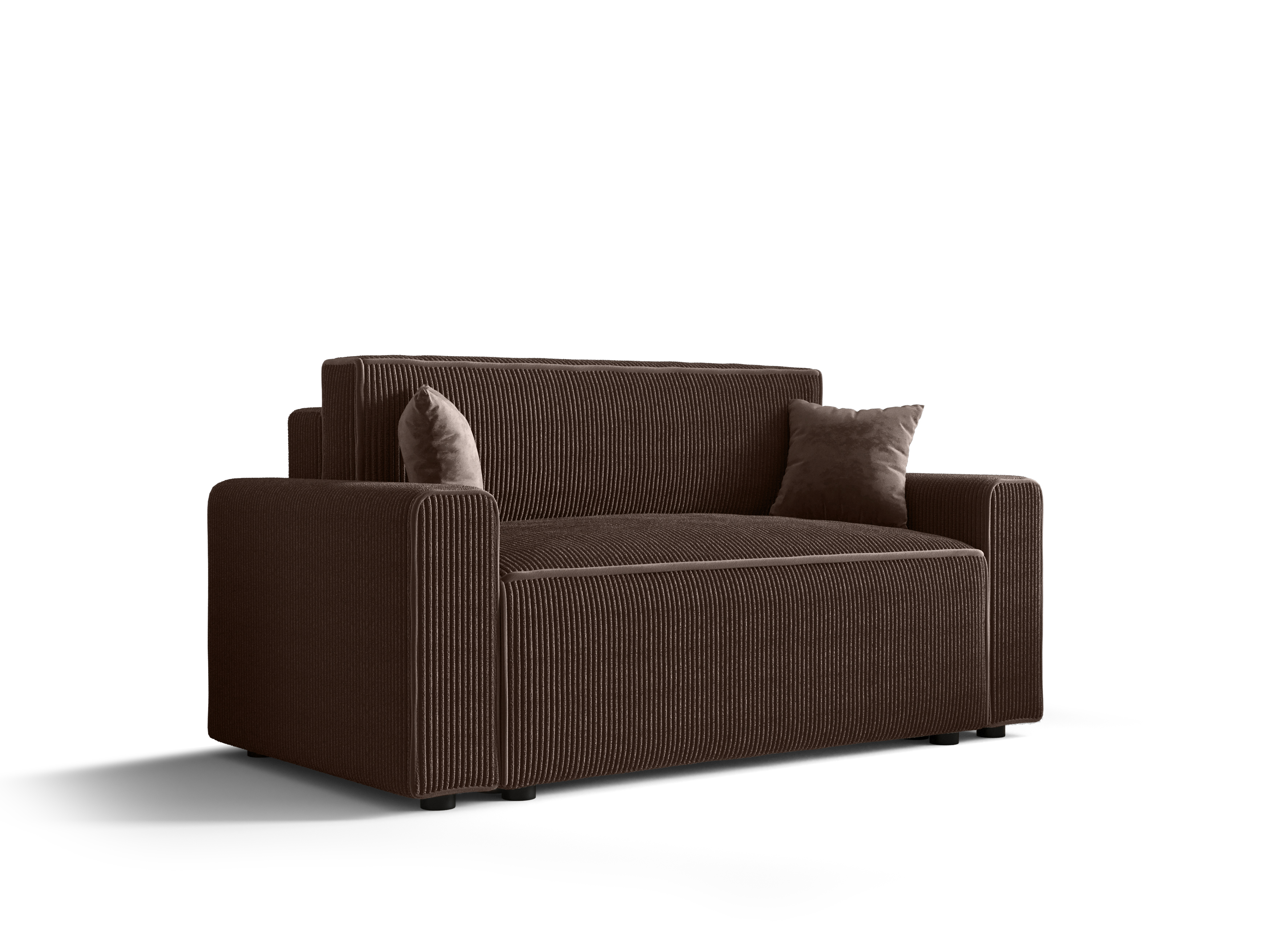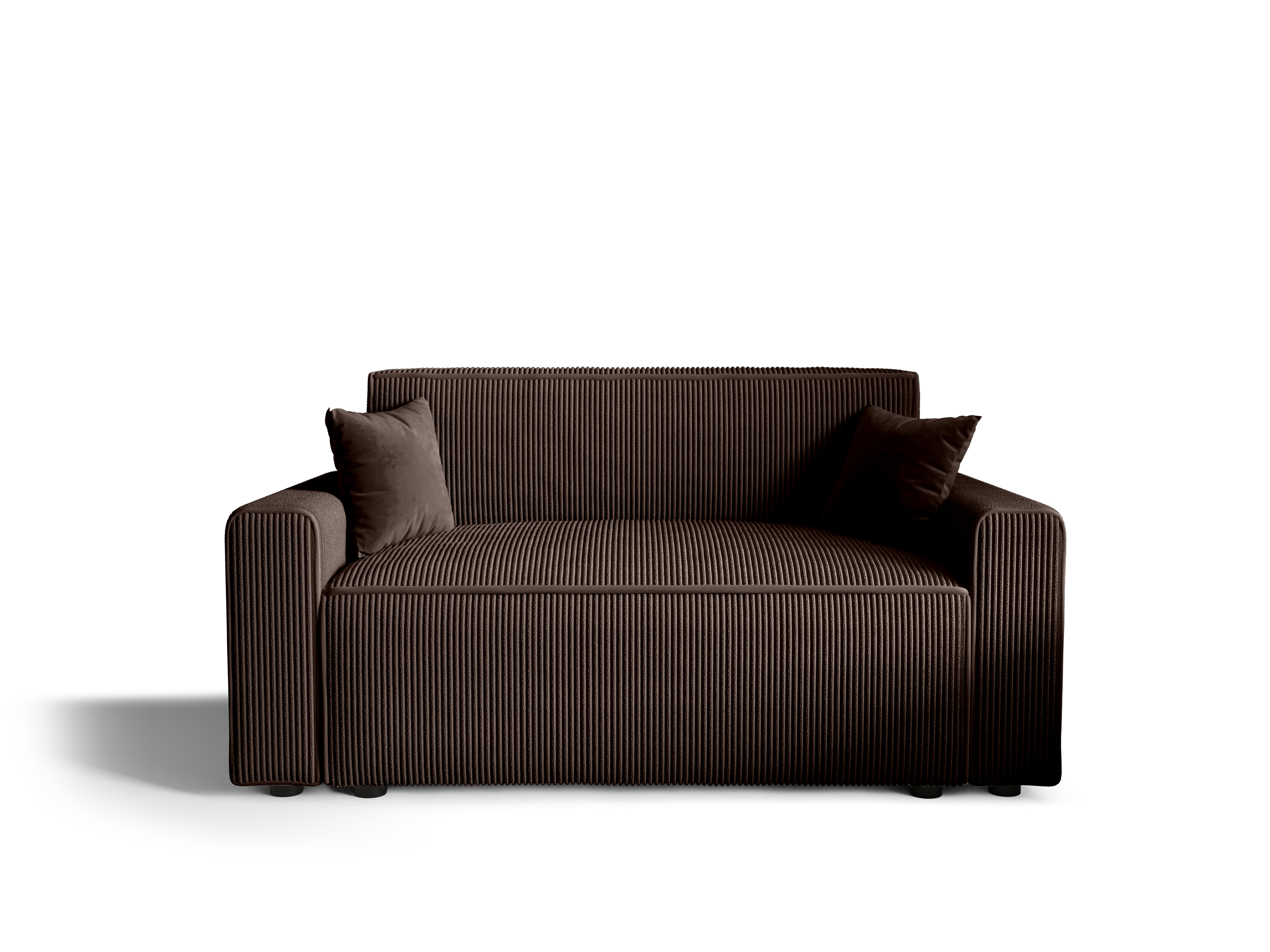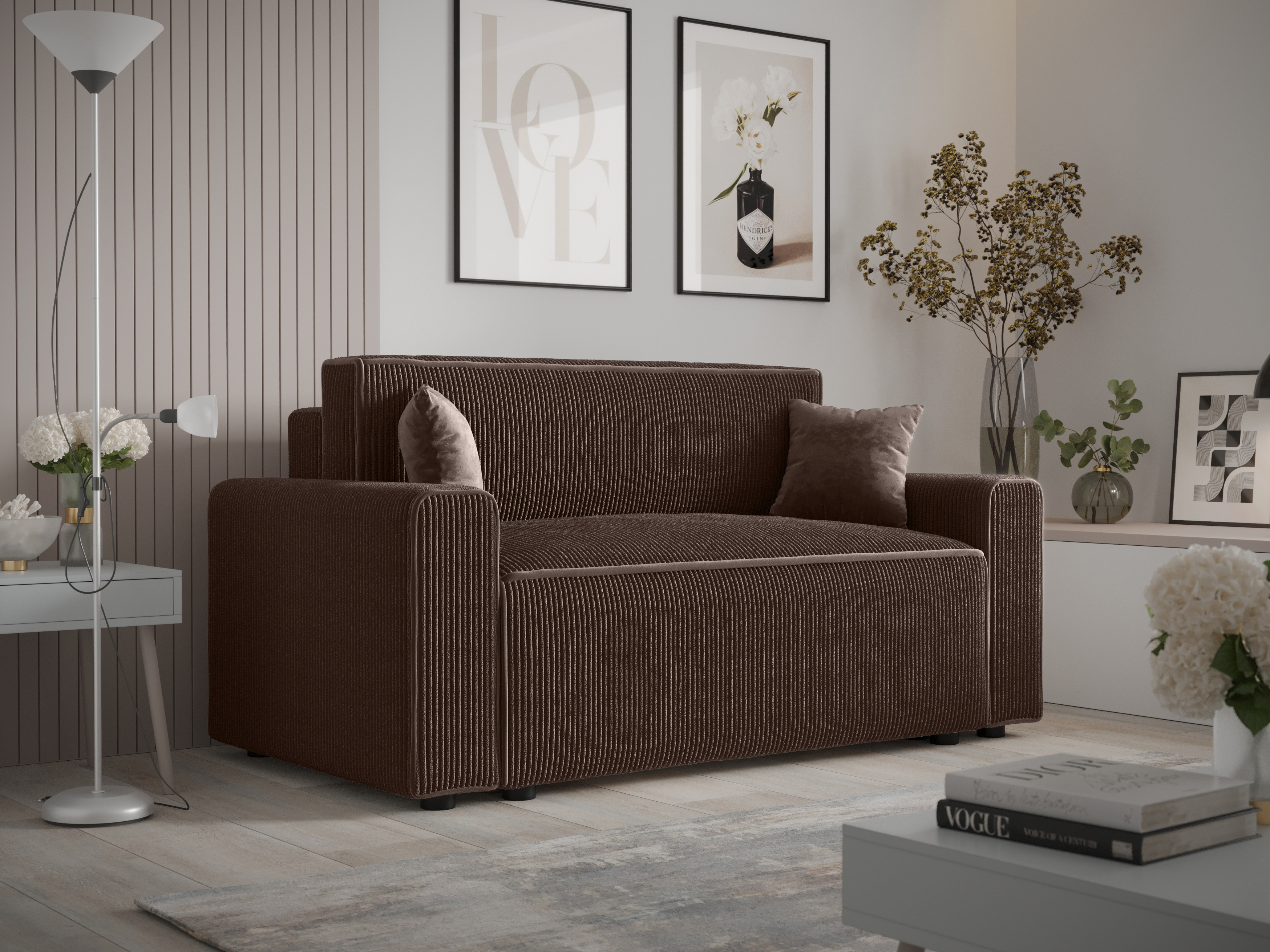 Pohovka dvojsedačka Mirage Bis v tmavohnedej farbe je ideálnym riešením pre každú obývaciu izbu, spálňu či pracovňu, kde oceníte kombináciu pohodlia a praktickosti. Jej pevná konštrukcia z dreveného rámu a drevotriesky zaručuje dlhú životnosť, zatiaľ čo kvalitná výplň z peny HR30 a pružín typu B poskytuje príjemné a ergonomické sedenie.